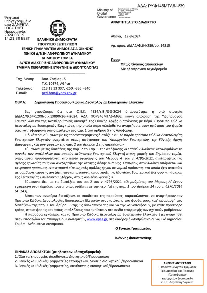 ΚΥΑ Πρότυπο Κώδικα Δεοντολογίας Εσωτερικών Ελεγκτών