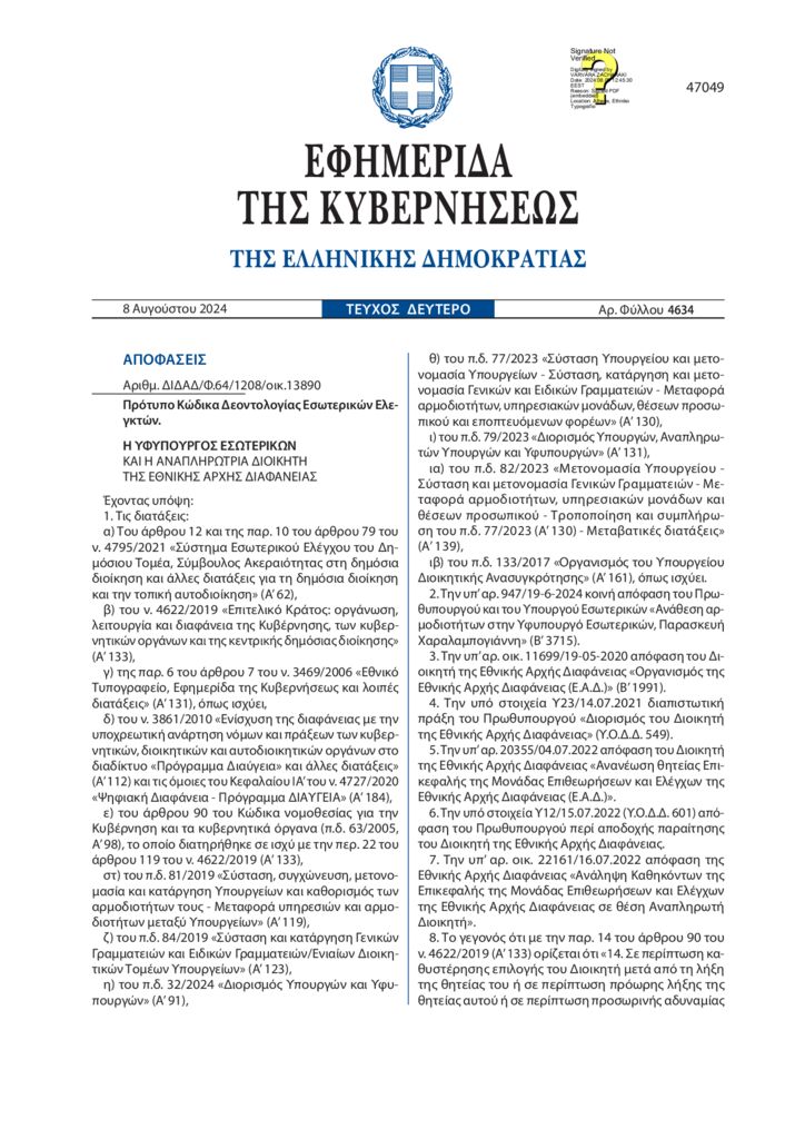 ΦΕΚ Πρότυπο Κώδικα Δεοντολογίας Εσωτερικών Ελεγκτών